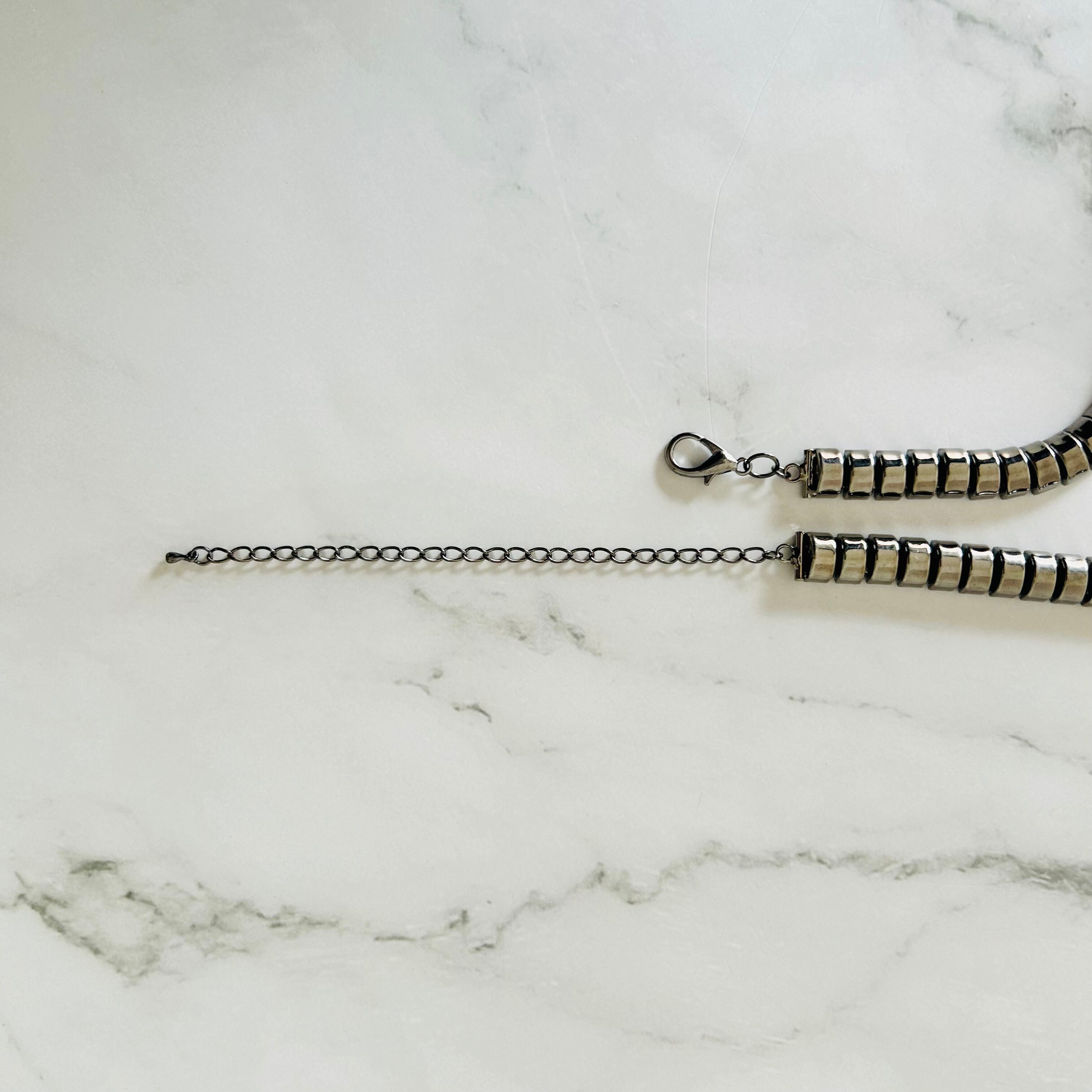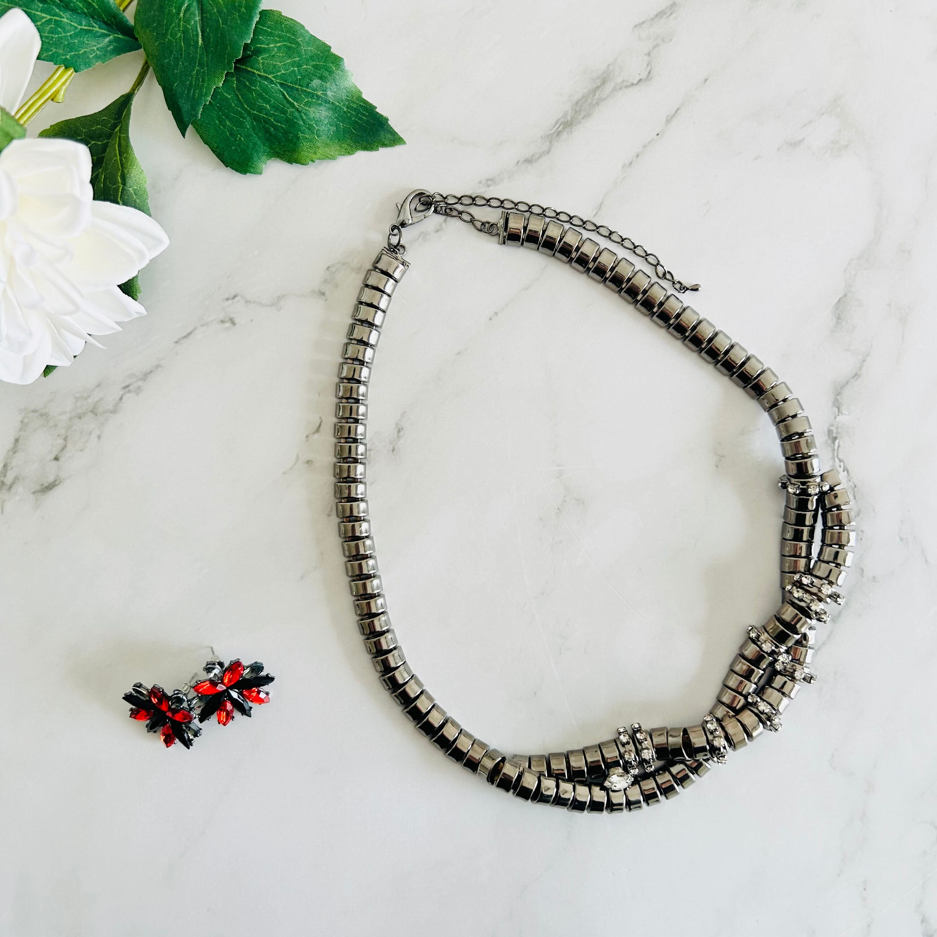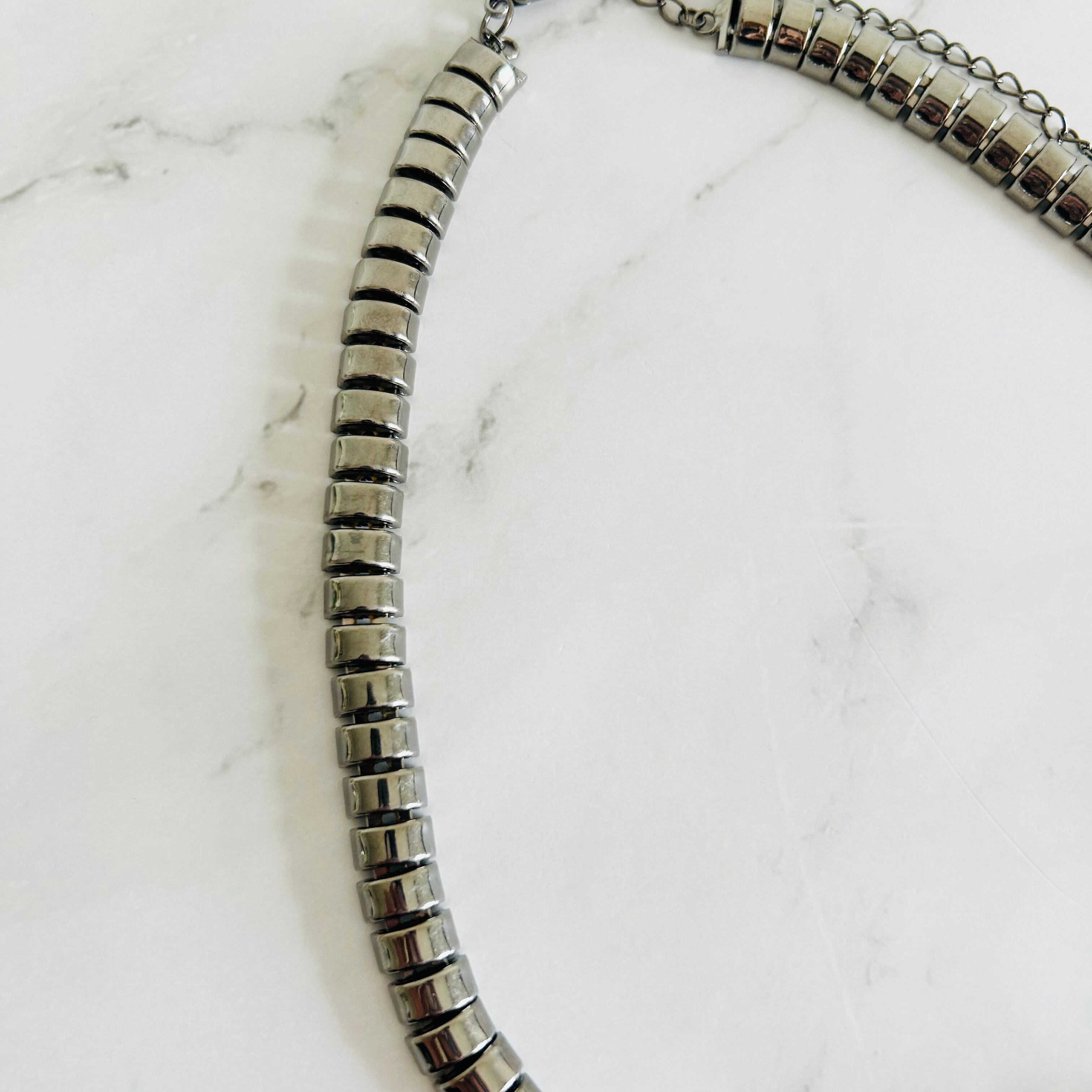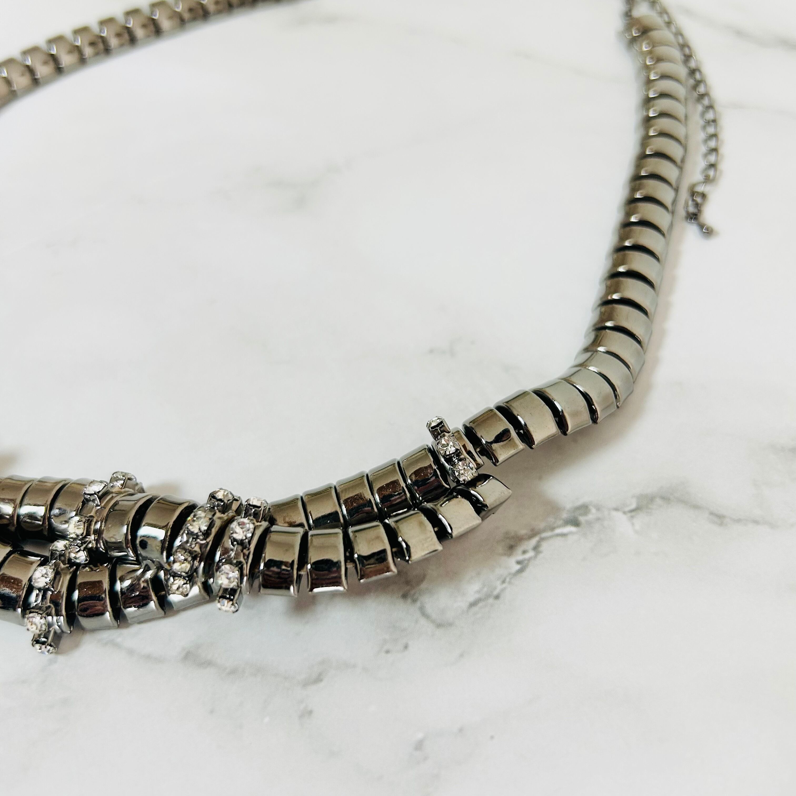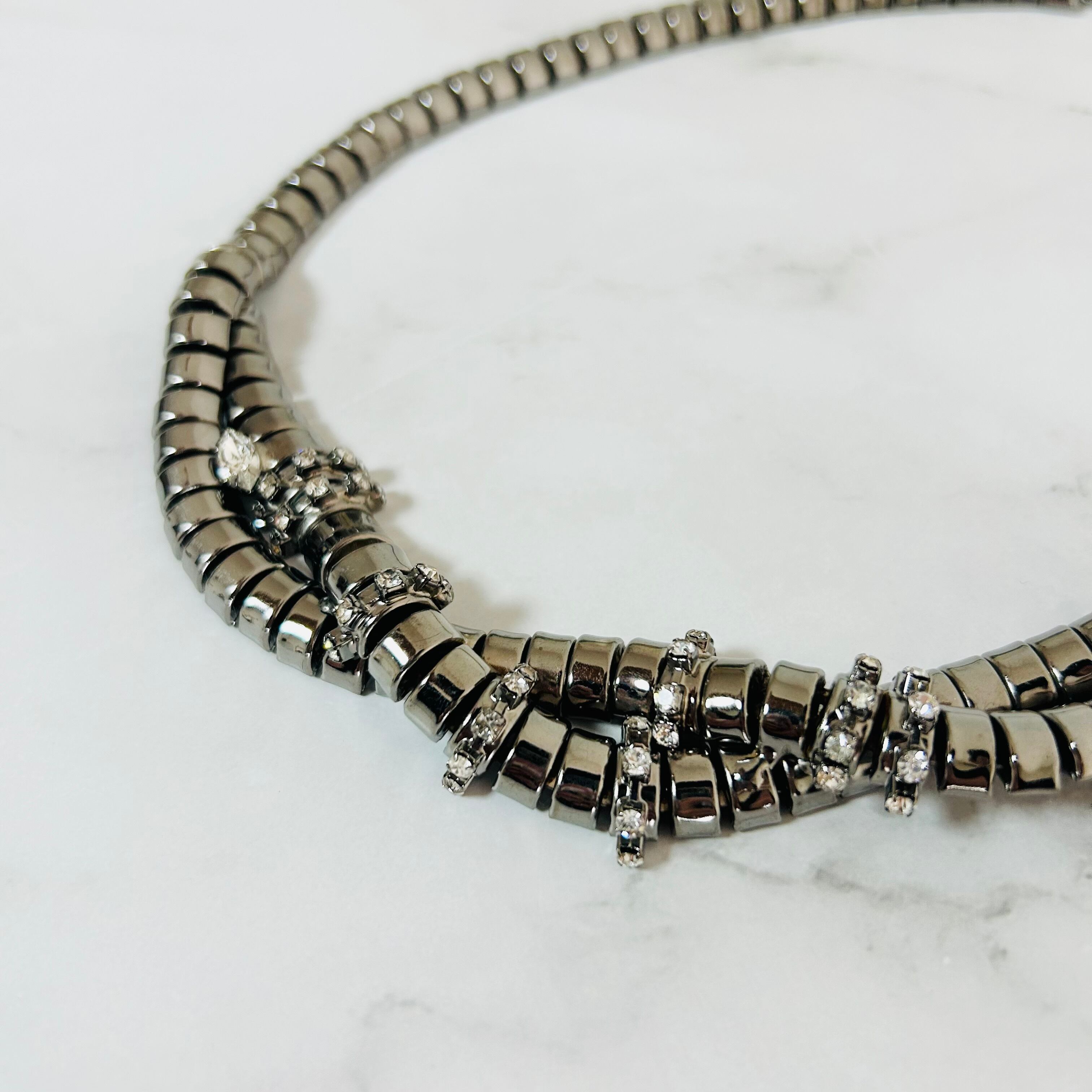 クールなブラックメタルカラーのチェーンにクリスタルビジューをプラスしたクールなデザインです。