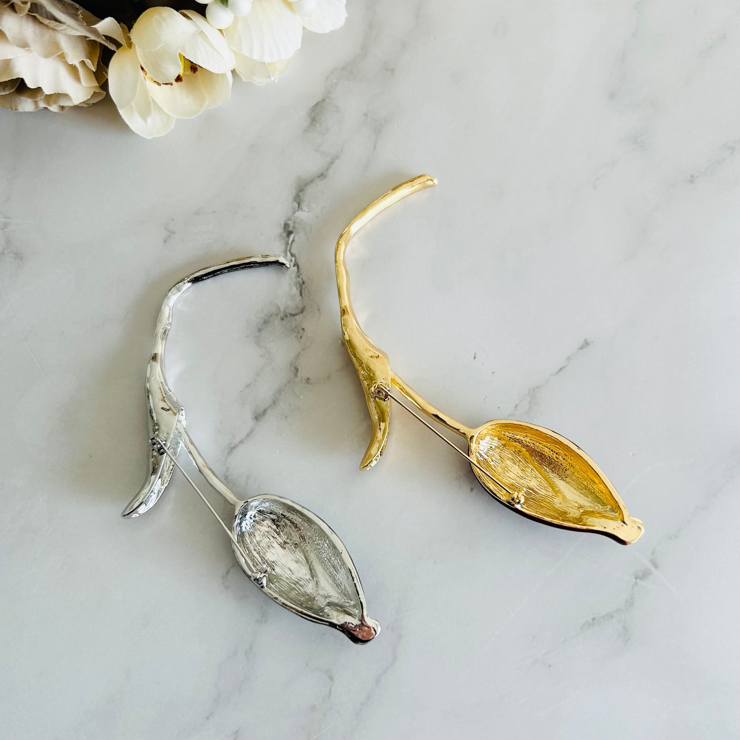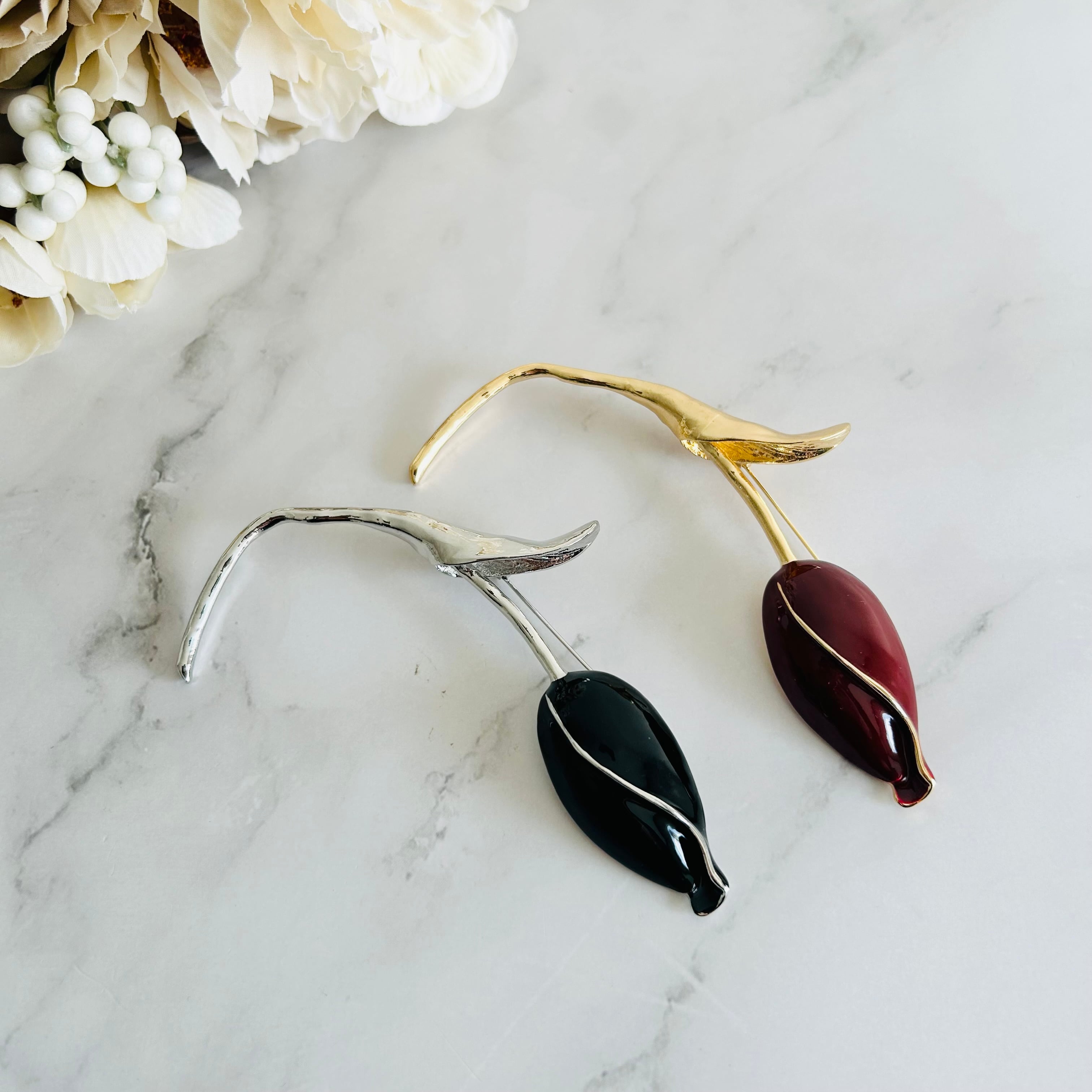 メッキパーツにエナメルグロスを施したツヤ感のあるチューリップモチーフのブローチです。