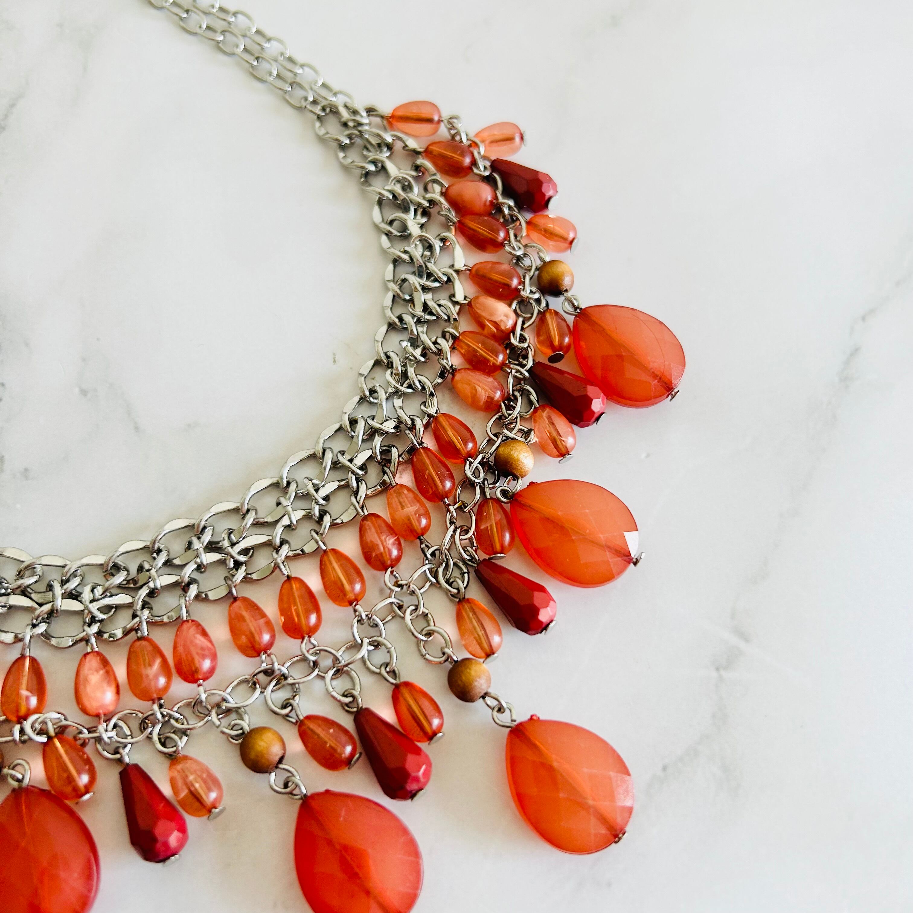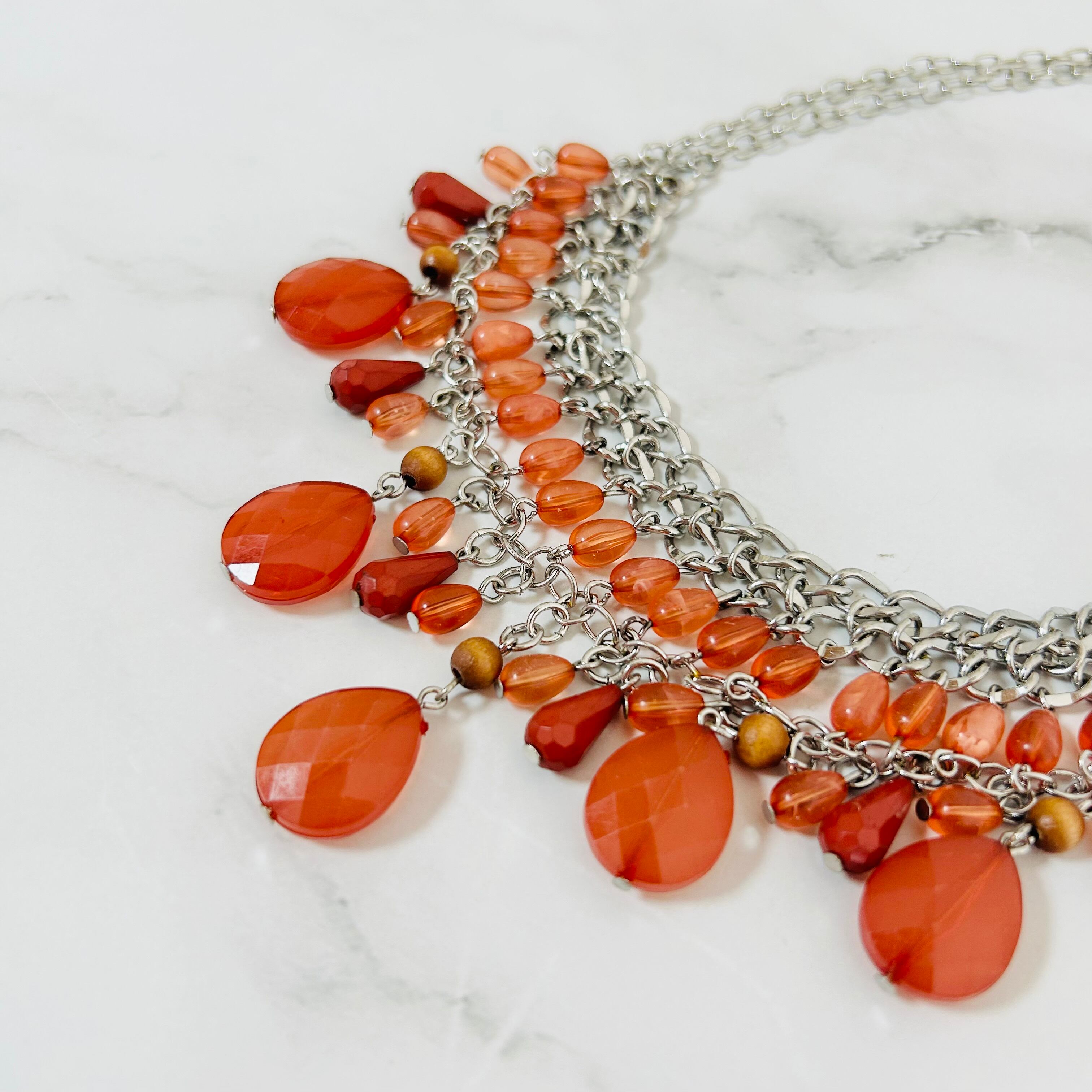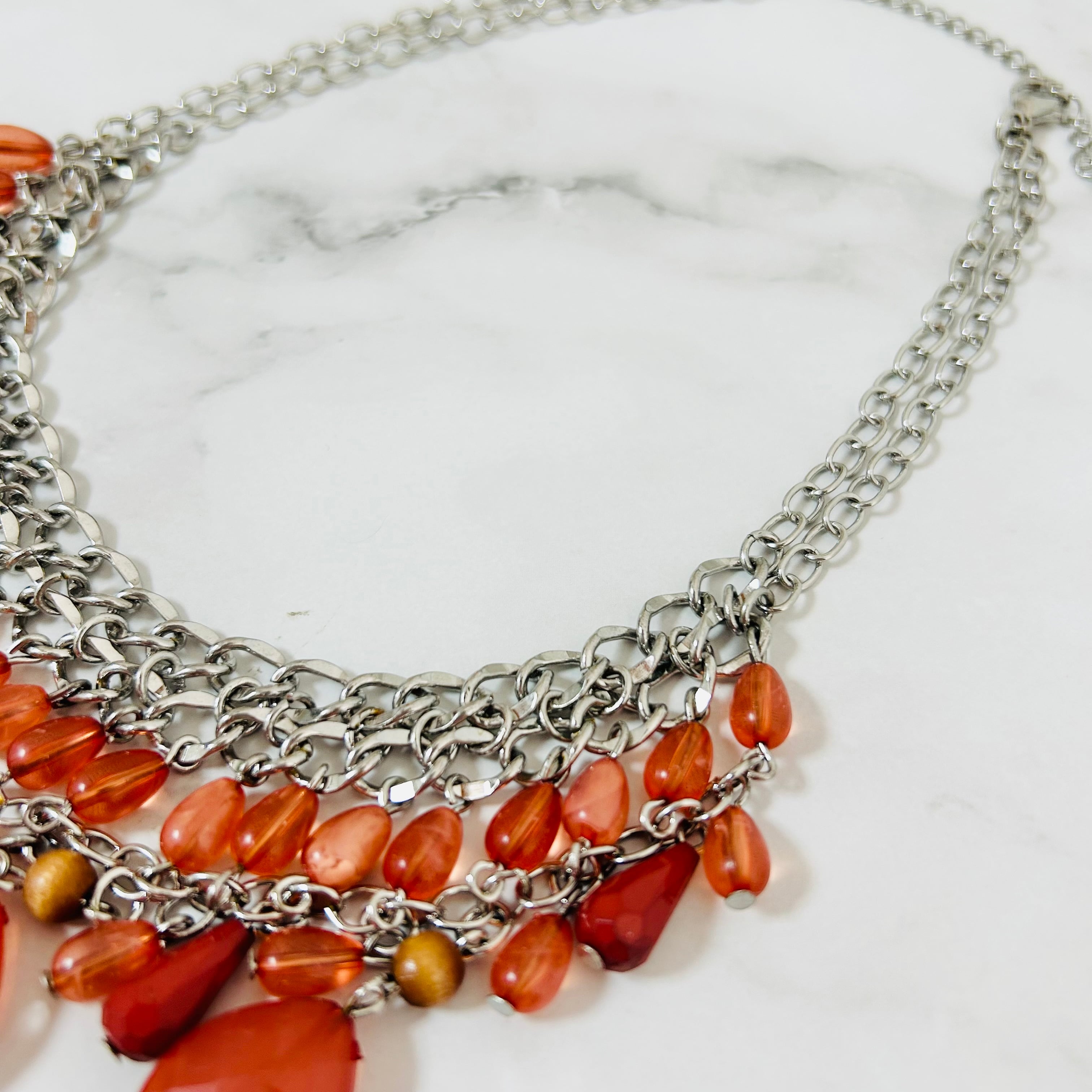 透明感のあるオレンジがかったレッドで統一した、アクリルパーツをメインにマーブル柄やウッドビーズを使用して作られたモチーフをシルバーチェーンに組み合わせたオリエンタル調のデザインです。