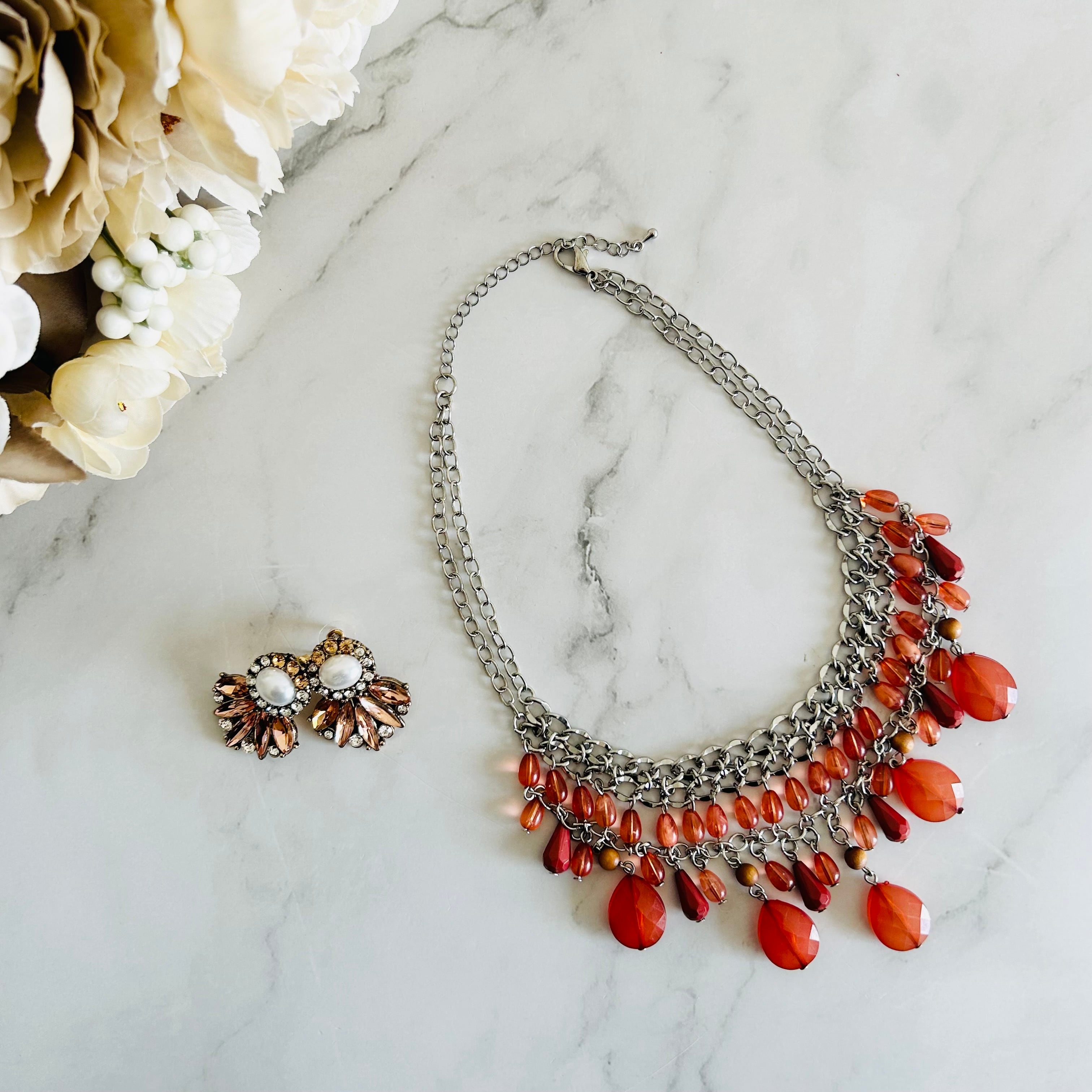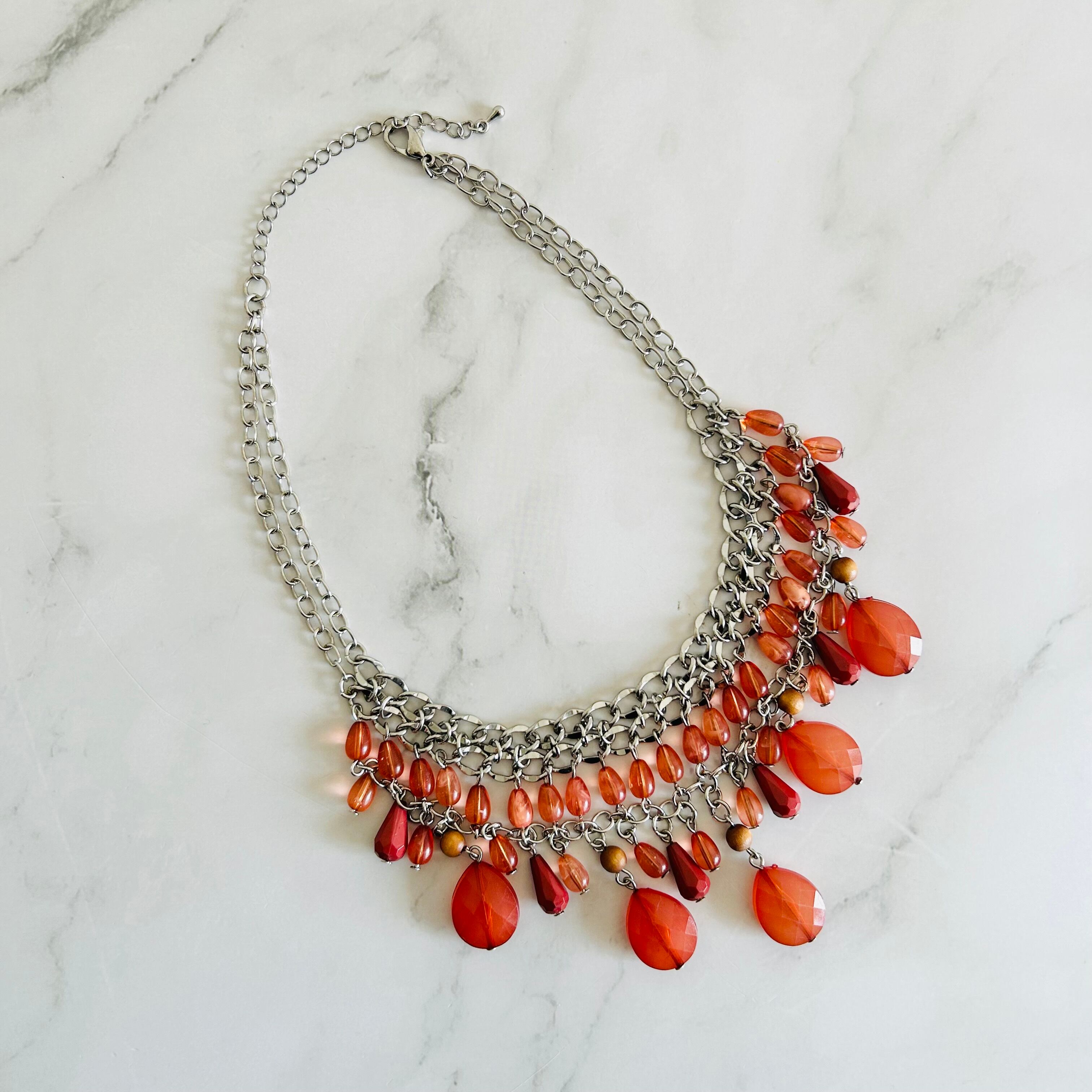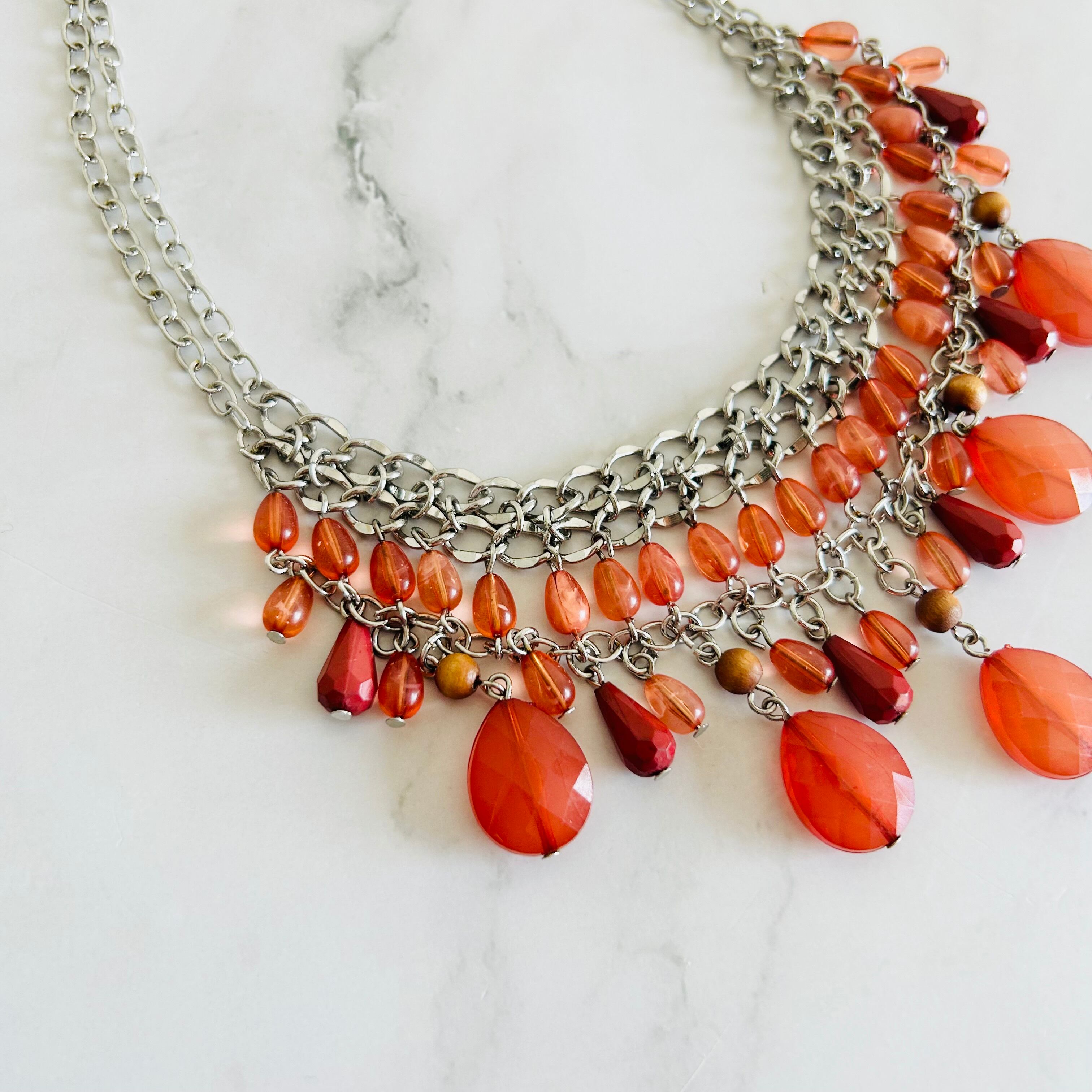 透明感のあるオレンジがかったレッドで統一した、アクリルパーツをメインにマーブル柄やウッドビーズを使用して作られたモチーフをシルバーチェーンに組み合わせたオリエンタル調のデザインです。