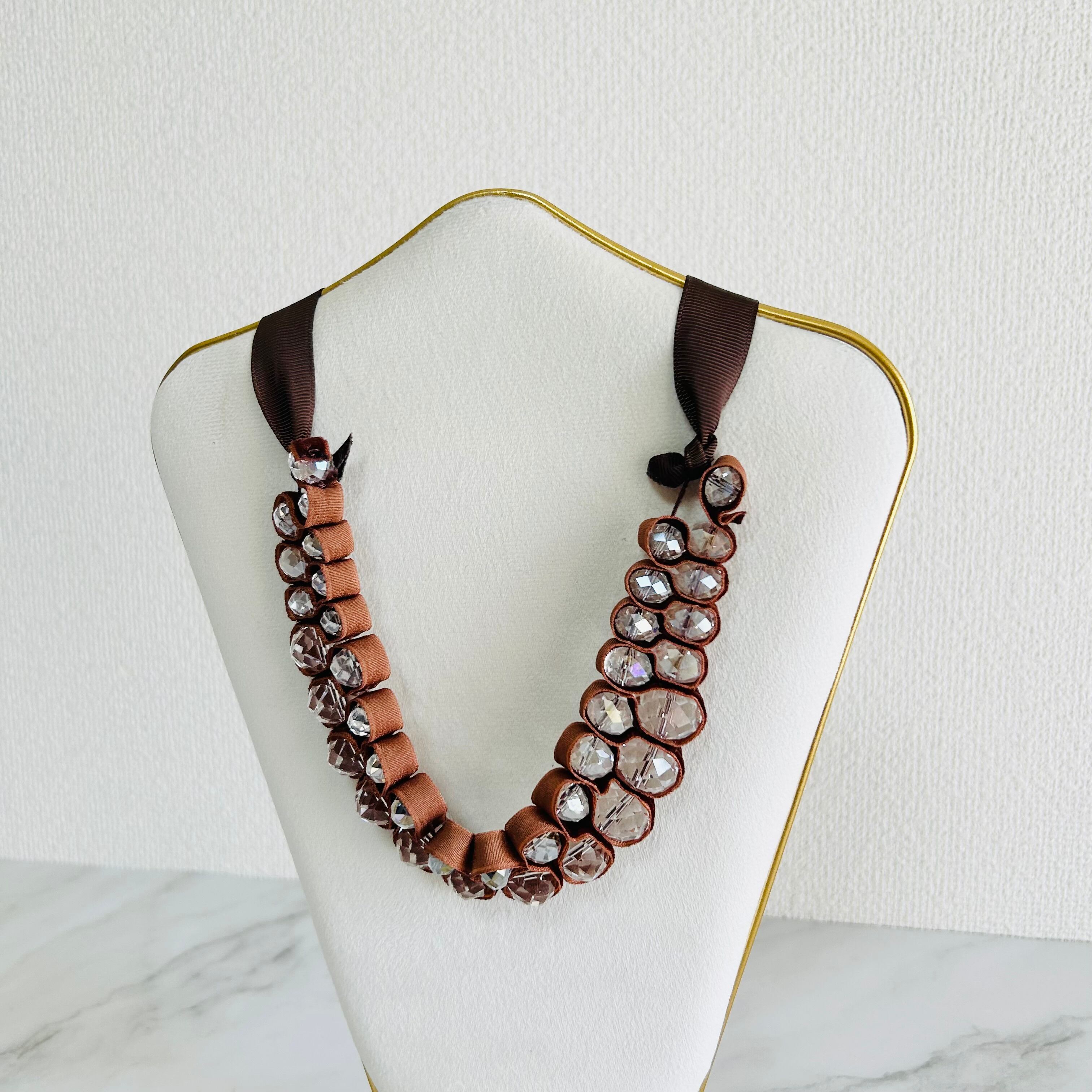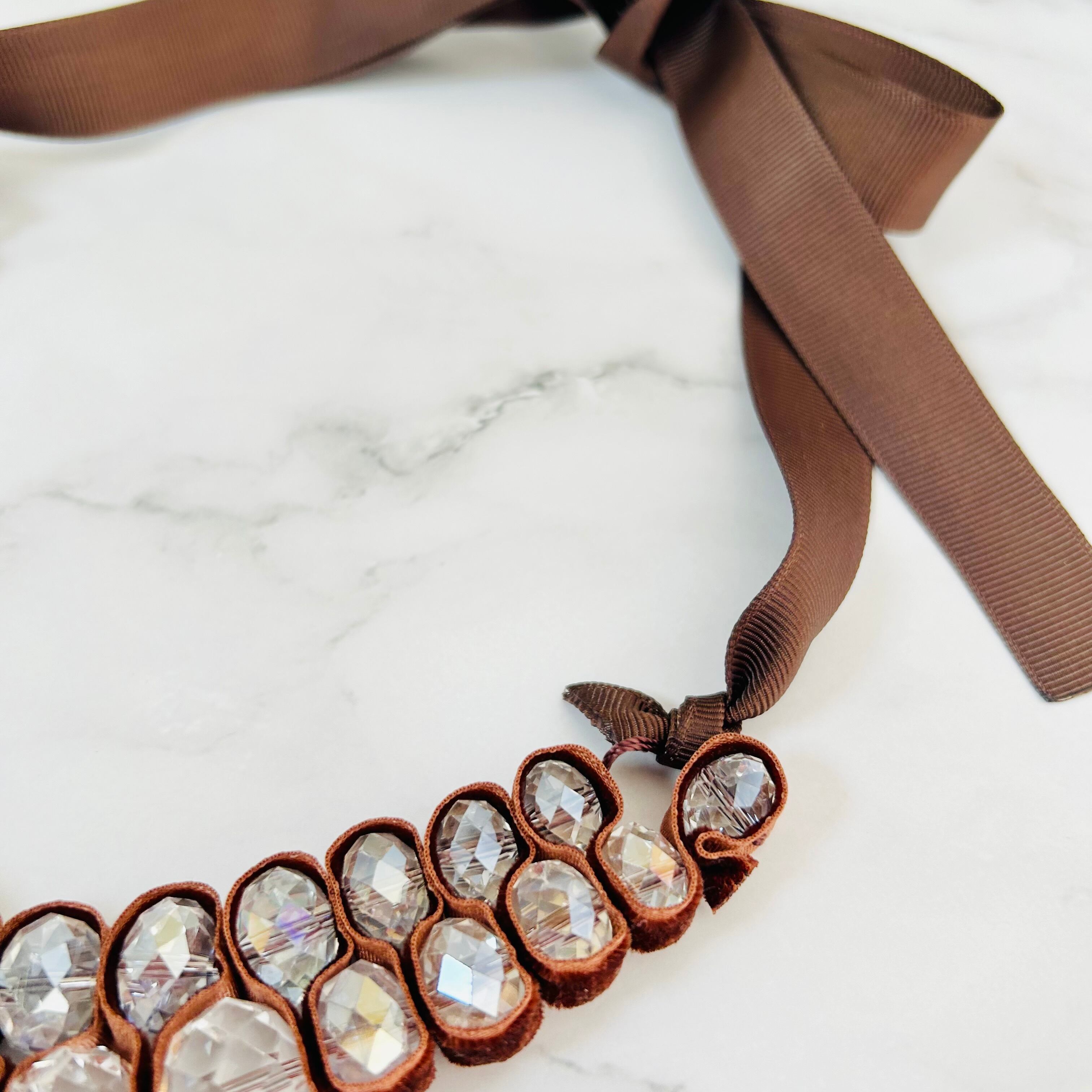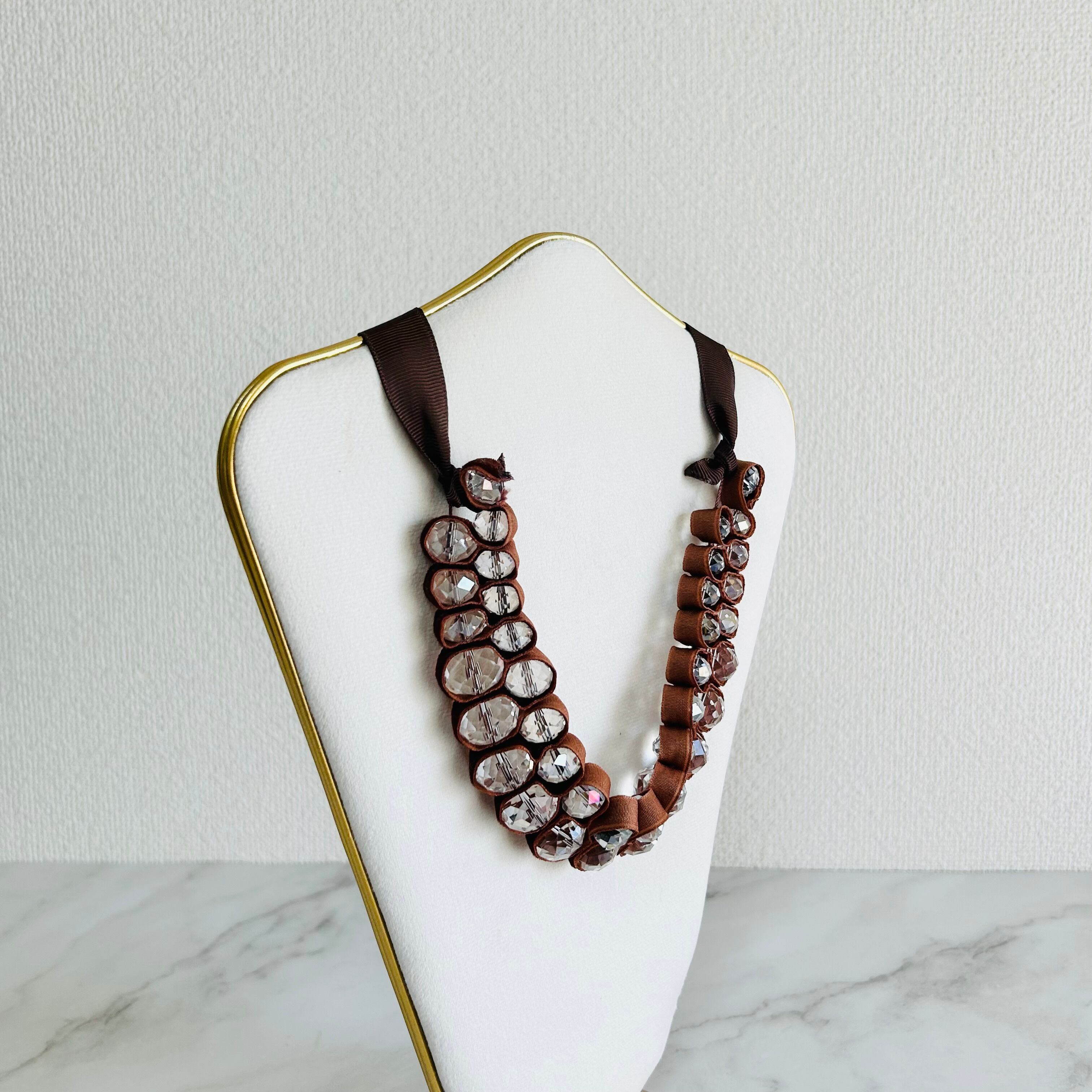 大粒でクリスタルカットを施したクリスタルビジューをブラウンのリボンで立体的に包んだユニークなデザインです。