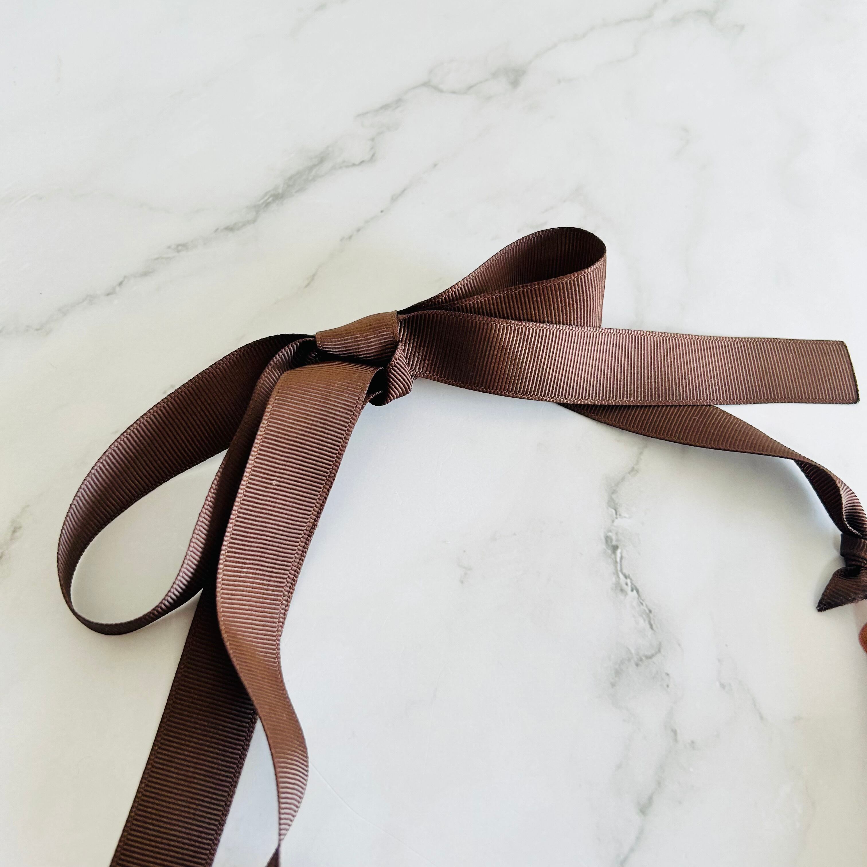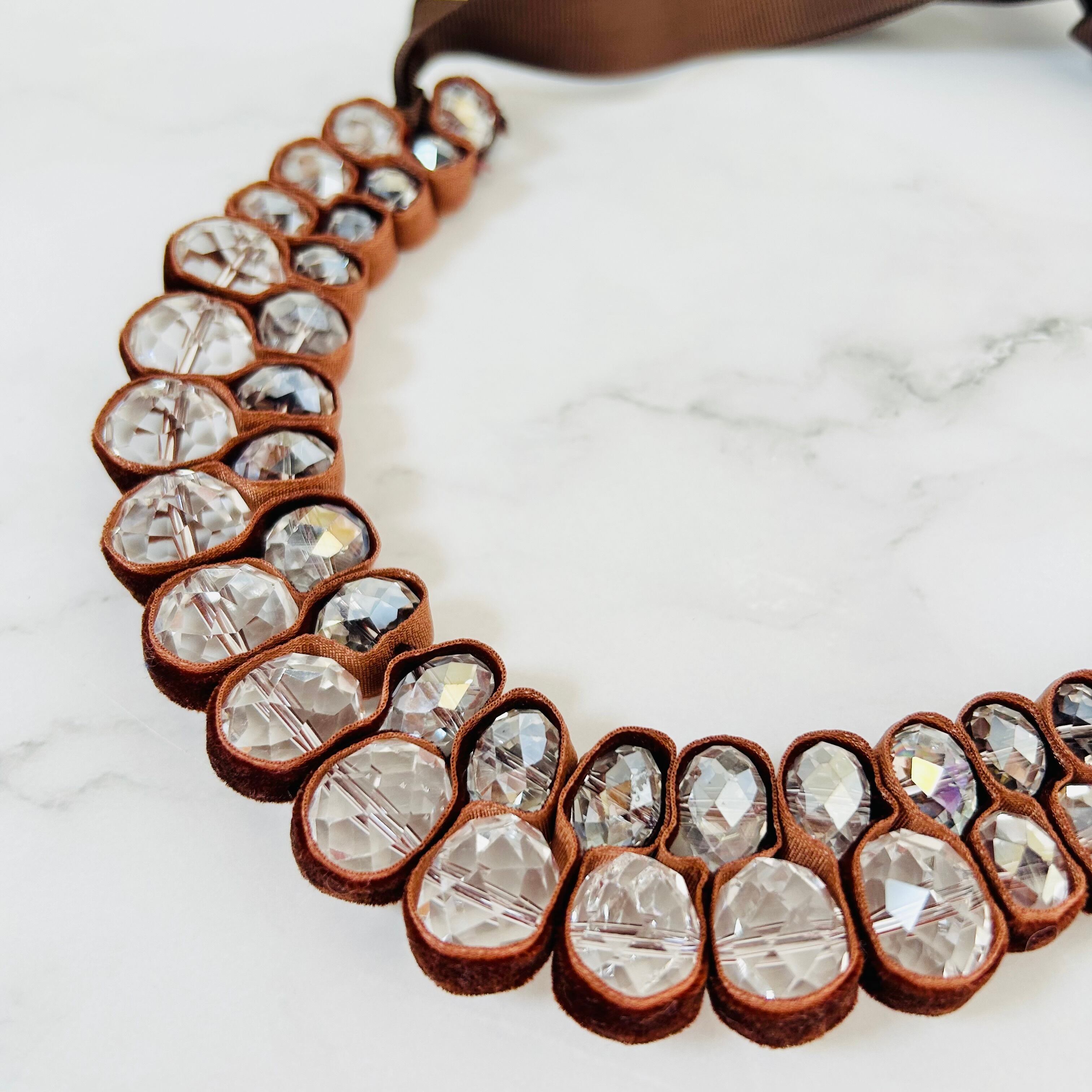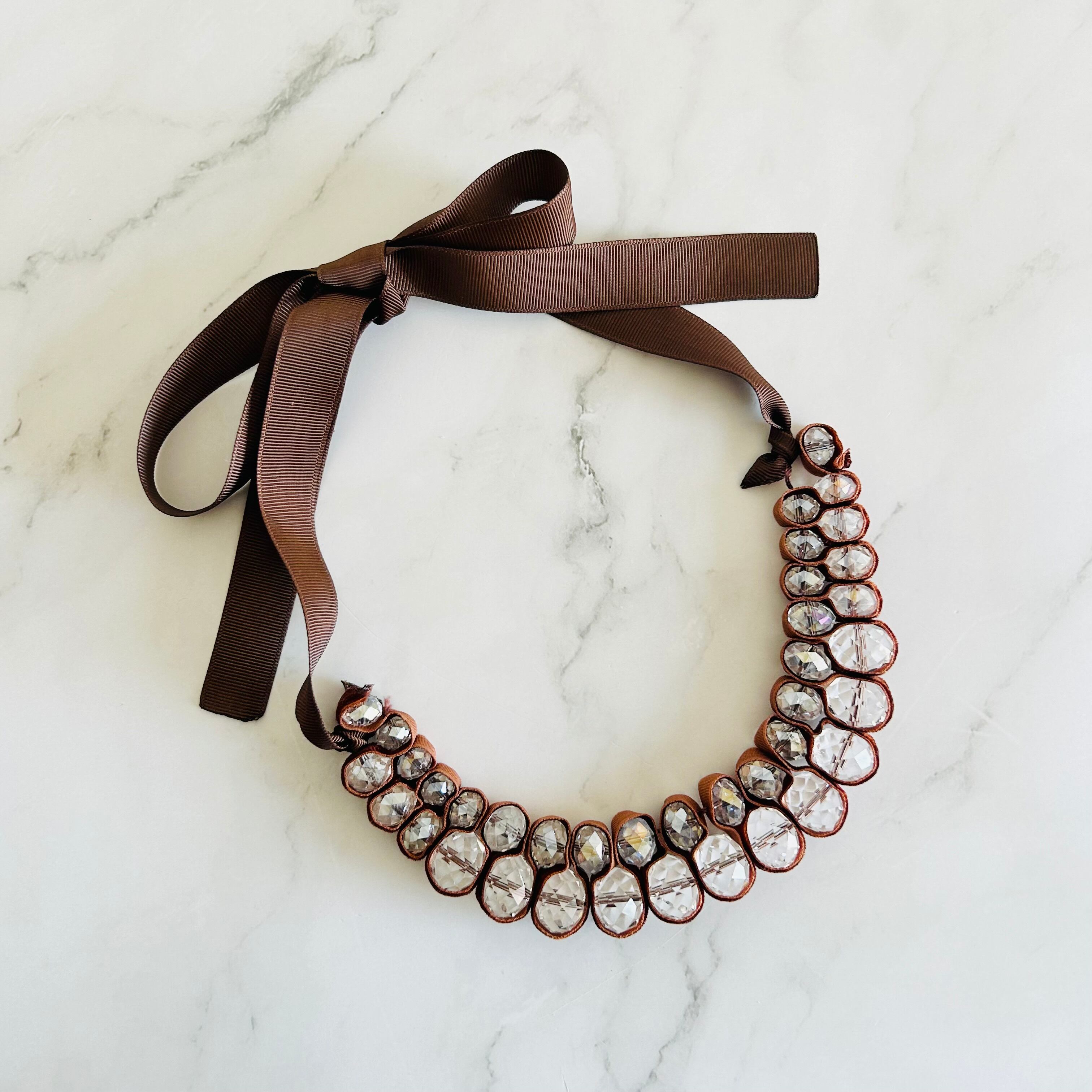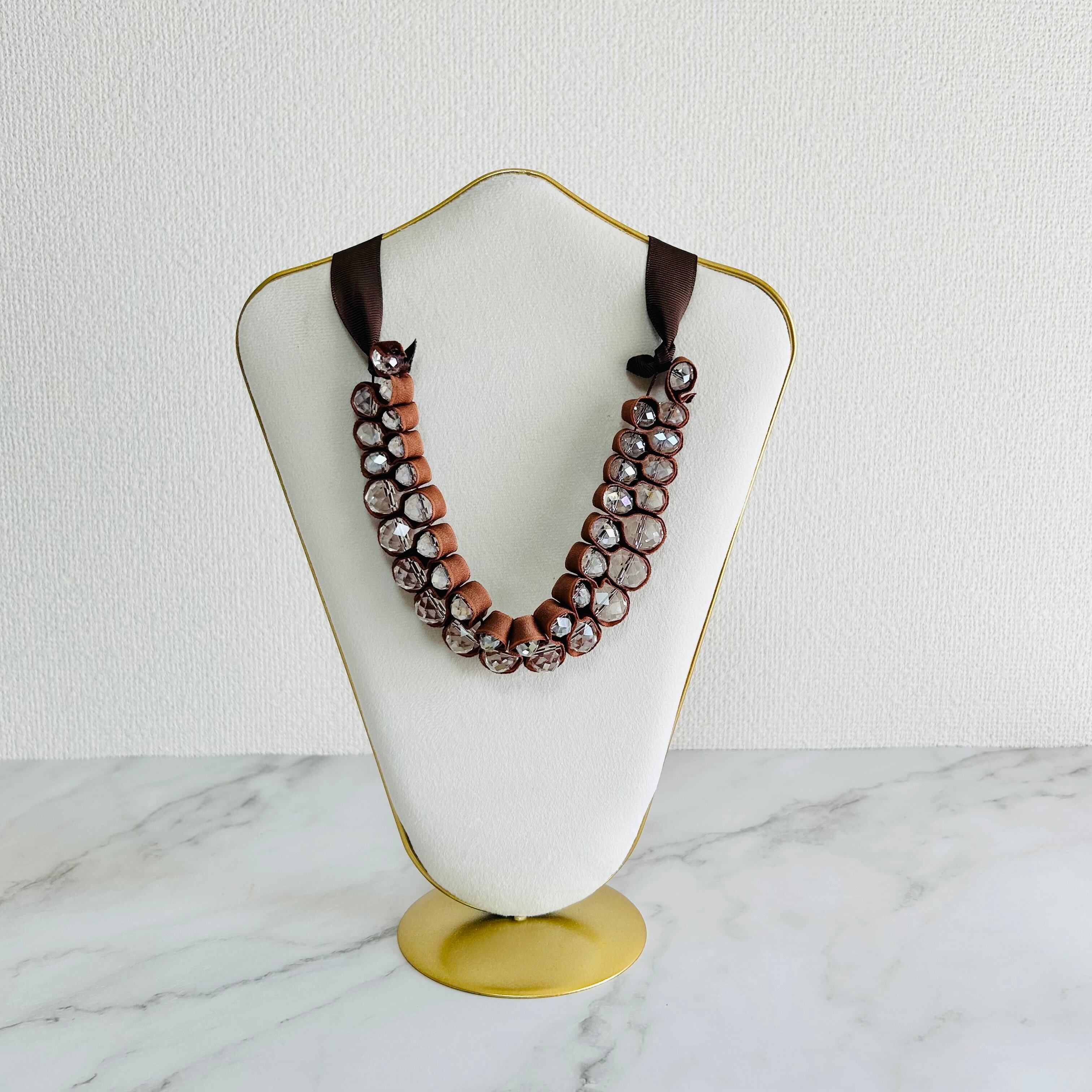大粒でクリスタルカットを施したクリスタルビジューをブラウンのリボンで立体的に包んだユニークなデザインです。